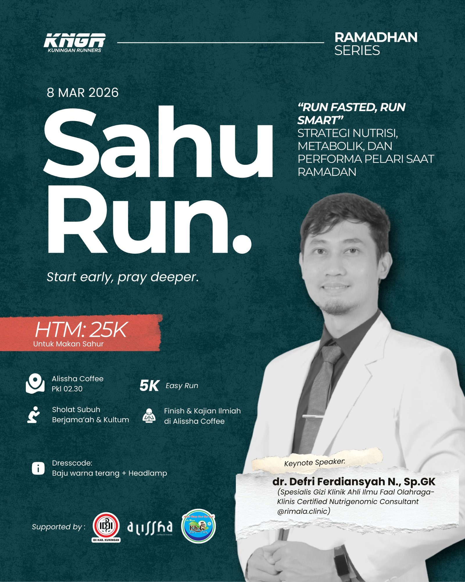 Masih dalam rangkaian Runmadhan Series bersama Kuningan Runners, kita akan berlari sembari menunggu waktu sahur, dilanjutkan sahur bersama dan solat berjamaah, ditutup dengan kajian ilmiah bersama dr. Defri Ferdiansyah N, Sp.GK (Dokter Spesialis Gizi Klinik Ahli Ilmu Faal Olahraga-Klinis Certified Nutrigenomic Consultant @rimala.clinic)